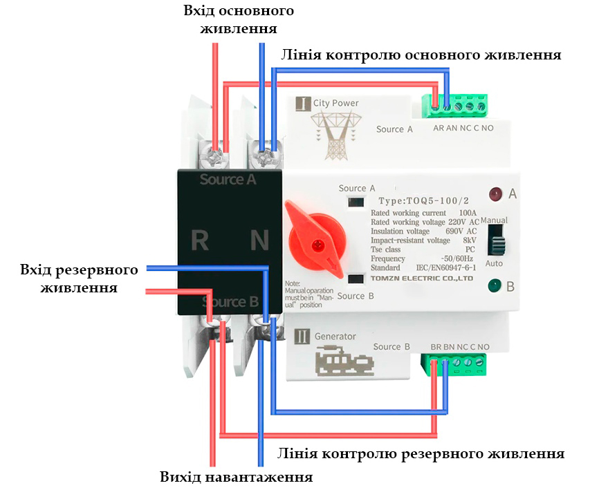 Автомат введення резерву АВР 2P 100А перемикач використовується в енергетиці для автоматичного або ручного включення резервних джерел живлення і забезпечує безперебійне електропостачання споживачів.