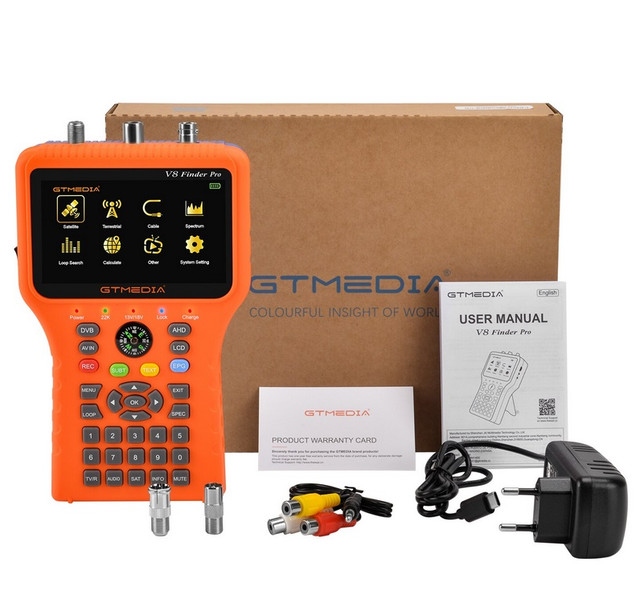 GTMEDIA V8 Finder Pro — портативний комбінований прилад, сумісний з DVB-S2X/S2/S/T2/T/C/ATSC-C і MPEG-2/4 H.264/H.265 (10 біт). Маючи компактні розміри, легку вагу, інтуїтивно зрозумілий користувацький інтерфейс, тривалий час роботи від батареї та багатий набір функцій, лічильник забезпечує всі функції, необхідні для встановлення та перевірки послуг цифрового супутникового телебачення, антенного та кабельного сигналів у житлових будинках або багатоквартирних будинках.